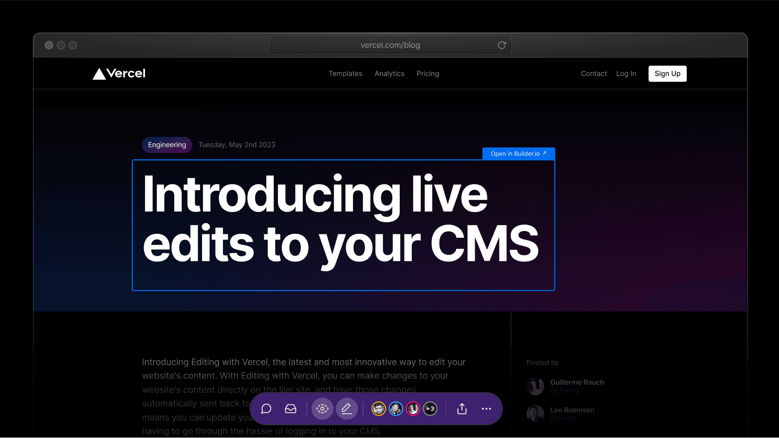 Visual Editing was another big step in bringing accessible collaboration to web development with a direct connection to your headless CMS. Since Vercel Ship, we have been working to onboard new customers like HashiCorp, Sonos, and Tome and we're happy to share that Visual Editing is now in public beta for Pro and Enterprise teams.