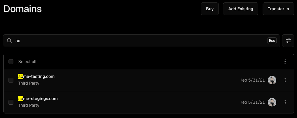 To view all your registered domains, go to the Domains tab in your Vercel dashboard.