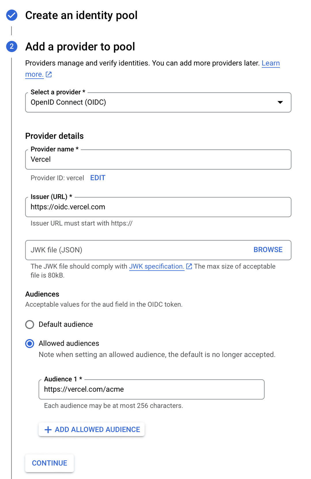 1. Once you have configured your GCP project with OIDC access, gather the following values from the Google Cloud Console: