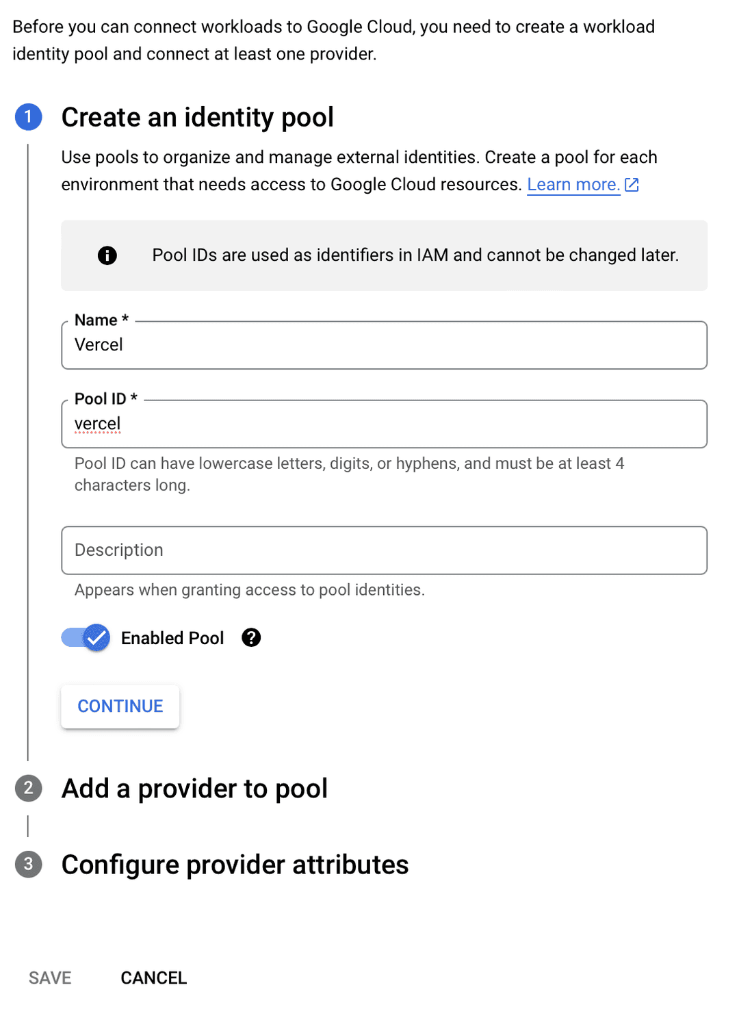 Workload Identity Pool Provider IDIAM & Admin -> Workload Identity Federation -> Pools -> Providers