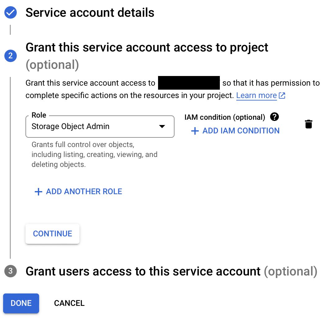 2. Enter an ID for the service account, e.g. and click Create and continue.