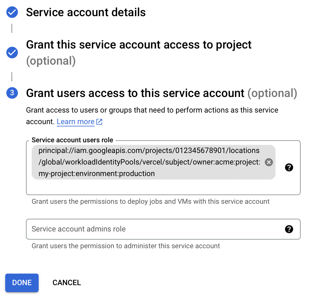 1. Paste in the IAM Principal copied from the pool details page in the Service account users role field.