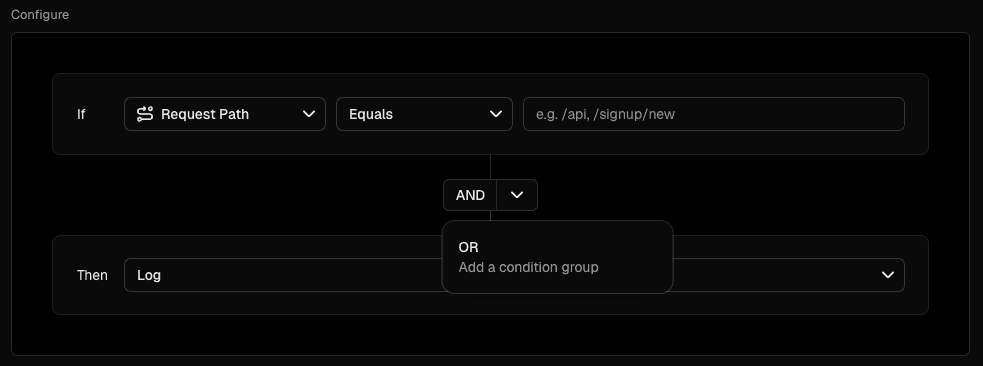 - In the Configure section, add as many If conditions as needed. For each condition you add, choose how you will combine it with the previous condition using the AND (Both conditions need to be met) or the OR operator (One of the conditions need to be met).